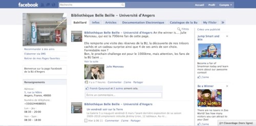 La bibliothèque Belle Beille de l’Université d’Angers dispose depuis peu d’une nouvelle page Facebook. En quelques semaines, cette page a attiré plus de 700 admirateurs. Plus récente encore, la page de la bibliothèque Saint-Serge, de la même université, lui fait concurrence : 641 adeptes.