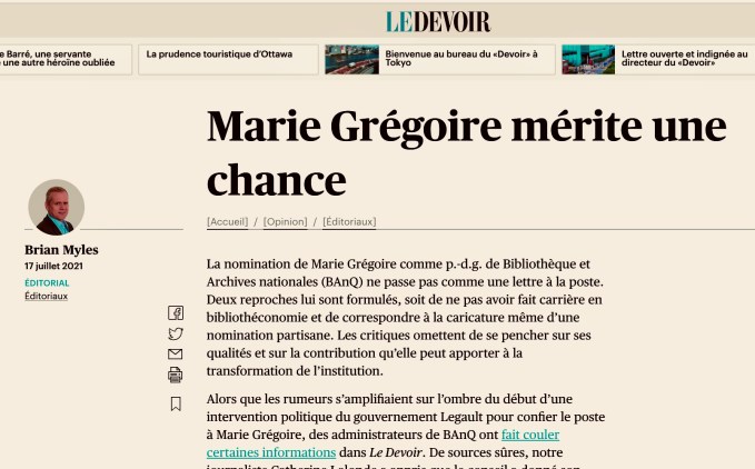 Ceci constitue le même argument que celui présenté dans l’éditorial de La Presse la semaine passée qui disait : « Si Marie Grégoire, qui a manifestement l’oreille des ténors de la CAQ, réussit à obtenir le budget nécessaire pour redonner à BAnQ les moyens de ses ambitions, sa nomination partisane aura tout de même été utile. » Dans les deux cas, l’argumentation est faible car on pourrait conclure exactement le contraire à partir des mêmes prémisses : à savoir que c’est précisément la proximité de Marie Grégoire avec la CAQ qui devrait nous faire craindre que la nommée soit le relais tout désigné pour achever le programme de démantèlement de ce service public qui s’est poursuivi sous le gouvernement actuel.
